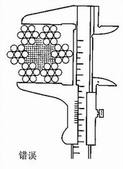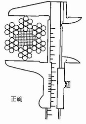 鋼絲繩實(shí)際直徑的測(cè)量需要使用合適的測(cè)量儀器,即寬度游標(biāo)卡尺。游標(biāo)卡尺的寬度必須跨越不少于相鄰兩股,于鋼絲繩繩端15 m外的直線部位上進(jìn)行測(cè)量,在至少相距1m的兩截面上進(jìn)行測(cè)量,且在每個(gè)點(diǎn)的相互垂直方向上測(cè)量兩個(gè)直徑。四個(gè)測(cè)量結(jié)果的平均值作為鋼絲繩的實(shí)測(cè)直徑。
